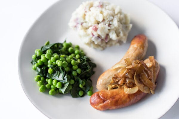 Juicy sausages, homemade garlic smashed potatoes, caramelized onions & assorted green veggies cooked to perfection. Delicious side onion gravy to top it off!